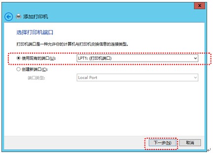 5. 按照以下方法選擇打印機所使用的端口,並選擇“下一步”。