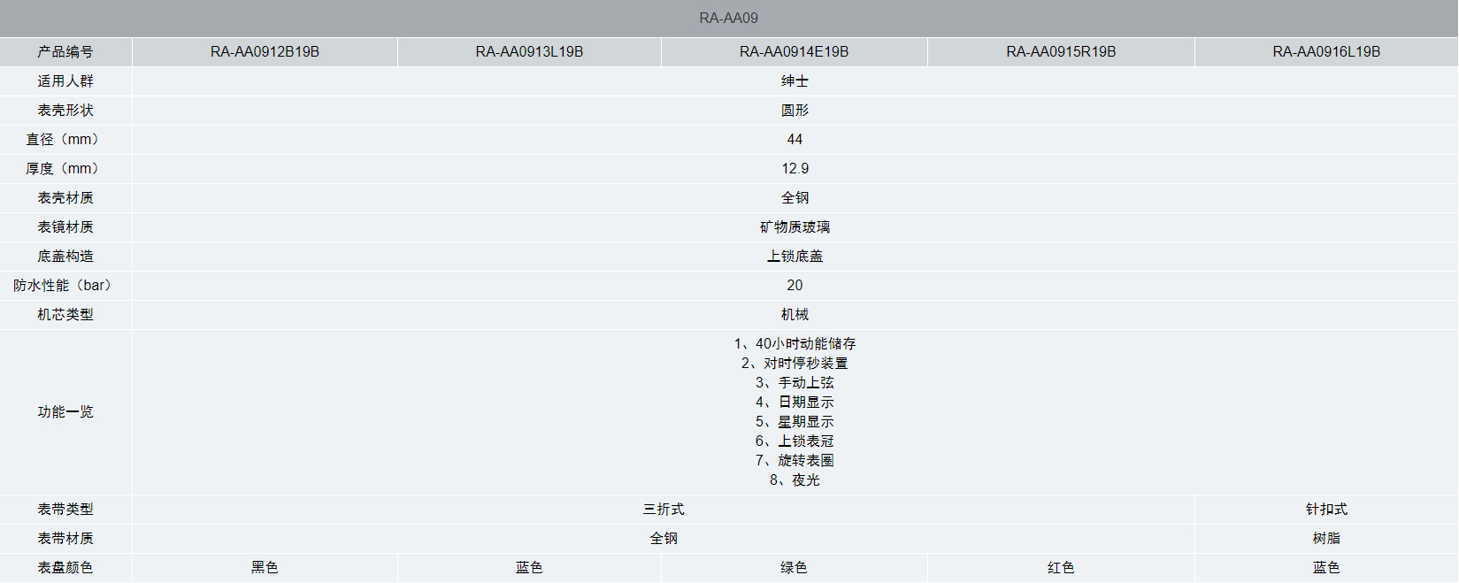 | 表盤顏色 | 黑色 | 藍色 | 綠色 | 紅色 | 藍色 |