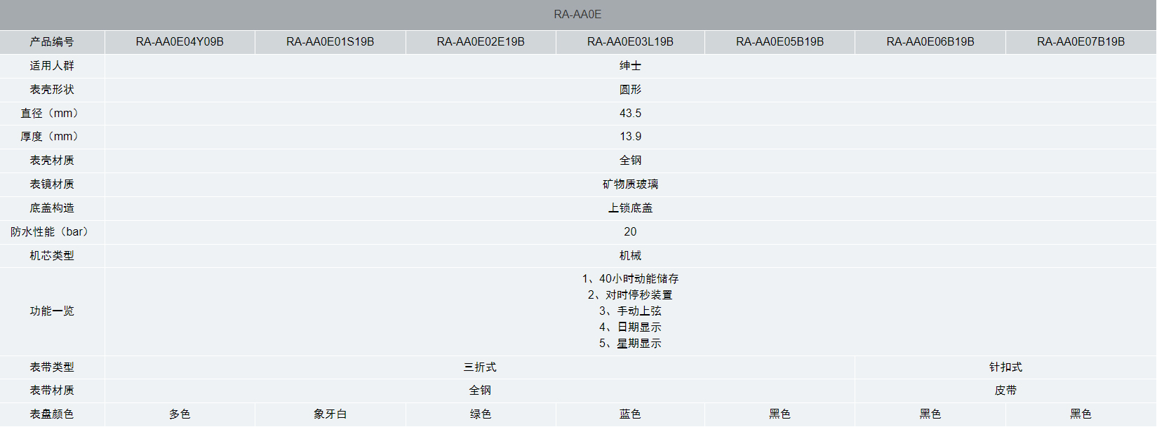 | 產品編號 | RA-AA0E04Y09B | RA-AA0E01S19B | RA-AA0E02E19B | RA-AA0E03L19B | RA-AA0E05B19B | RA-AA0E06B19B | RA-AA0E07B19B |