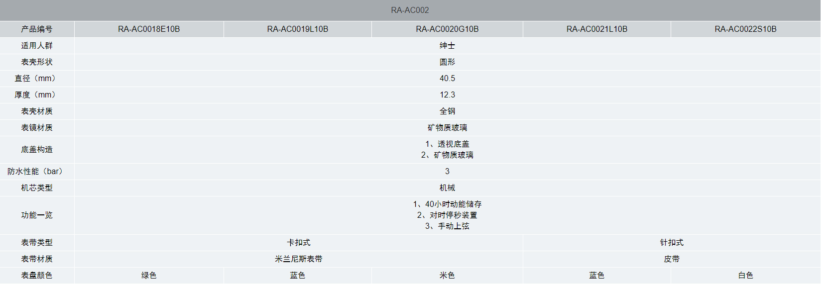| 產品編號 | RA-AC0018E10B | RA-AC0019L10B | RA-AC0020G10B | RA-AC0021L10B | RA-AC0022S10B |