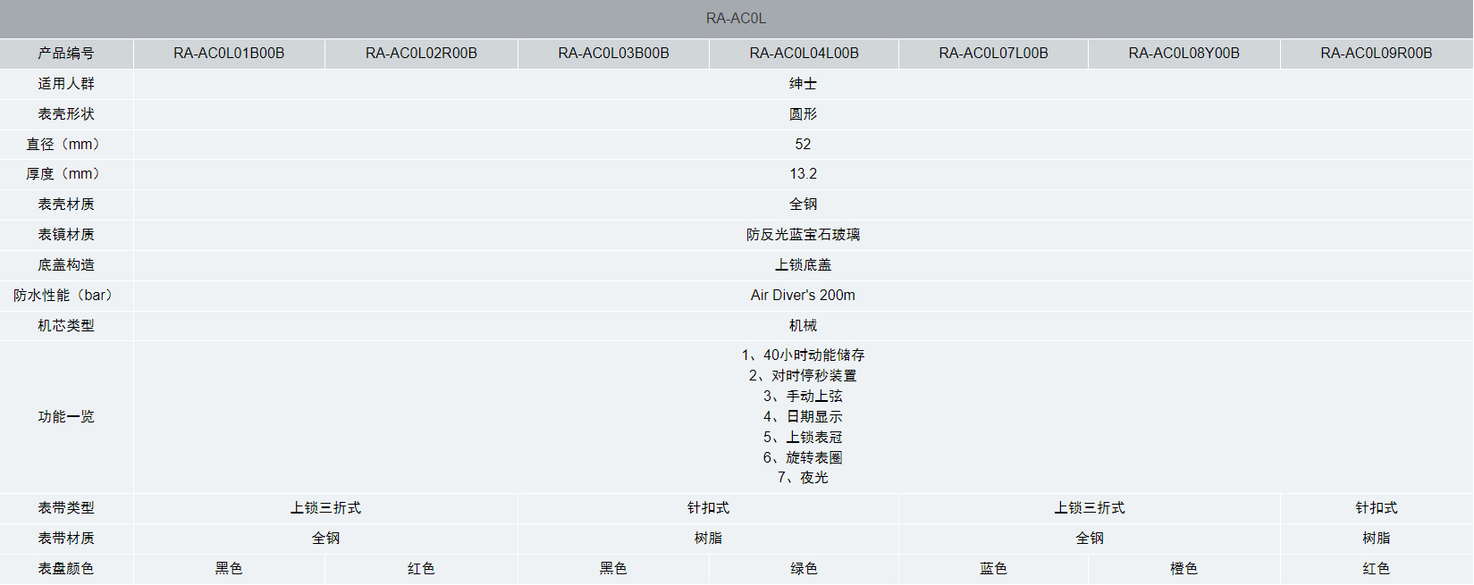| 功能一覽 | 1、40小時動能儲存 2、對時停秒裝置 3、手動上弦 4、日期顯示 5、上鎖表冠 6、旋轉表圈 7、夜光 |