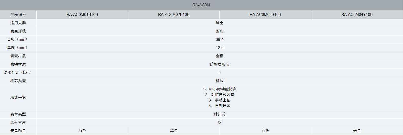 | 表盤顏色 | 白色 | 黑色 | 白色 | 米色 |