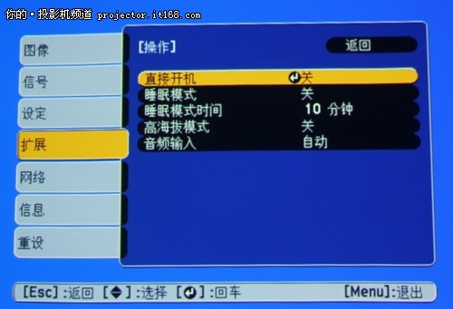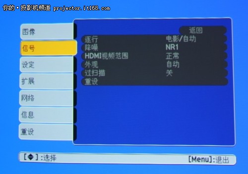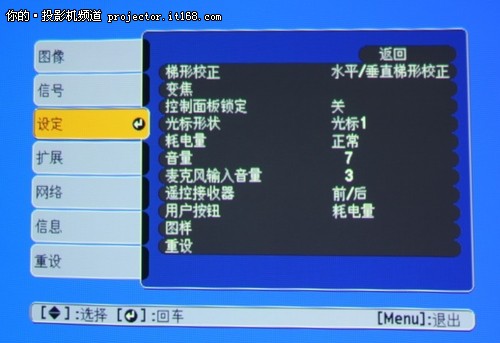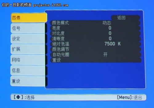 在主菜單功能應用中,我們能夠看到圖像、信號、設定、擴展、網絡、信息等功能的設置,其中比較常用的應該說是圖像和設定功能,在圖像設置中,用戶可以設置亮度、對比度、清晰度等等。在設定功能中,用戶可以設置梯形校正、變焦等等。