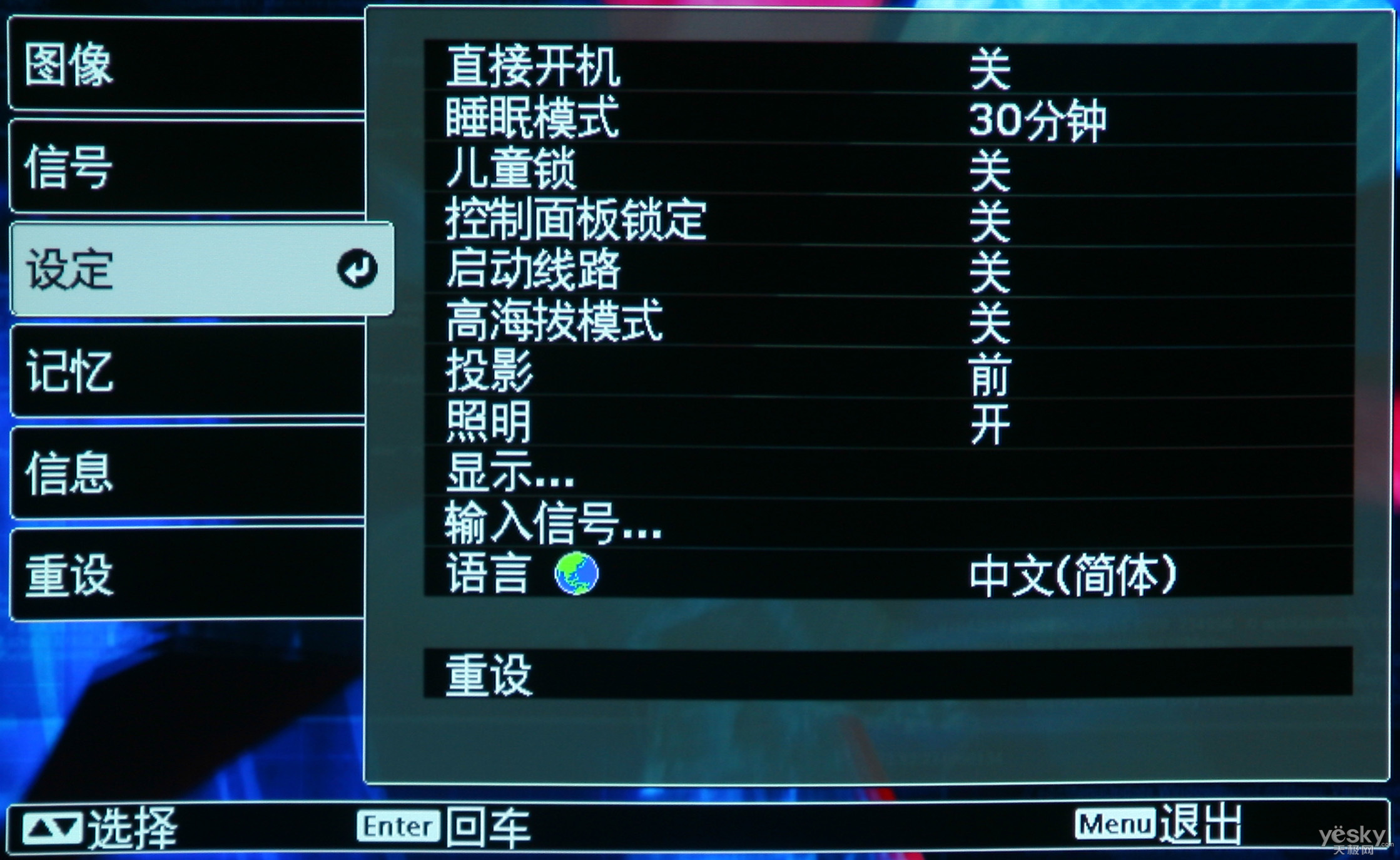 設置菜單中可以對投影機本身的一些功能進行設置,比如語言,控製麵板鎖定等。