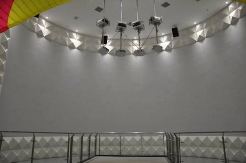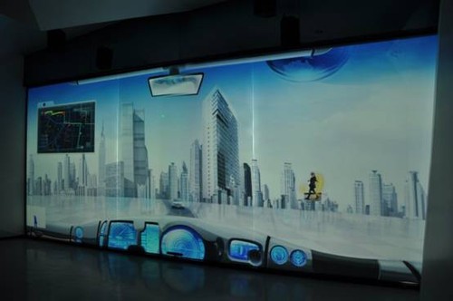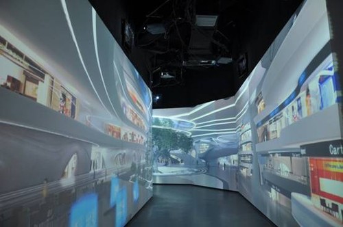 展廳的弧幕展示係統應用了8台愛普生高端工程投影機CB-G6350,采用8通道融合的方式,在弧長18米,高6米的弧形屏幕上投影,帶來沉浸式震撼效果。CB-G6350采用普生領先的3LCD技術,色彩亮度高達7000流明,分辨率為1024x768,對比度為5000:1,能夠輕鬆駕馭任何高端的大型展示場所,投射出色澤絢麗、明亮清晰的大畫麵。本案例中,弧幕展廳所處位置特殊,屬於平麵圖上"凸"型的頂端部分,因此投影機的安裝位置和投影距離都很受限,本方案為CB-G6350選用了ELPLU01短焦鏡頭,該鏡頭的寬屏投射比僅為0.64,並擁有1.2倍光學變焦,配以大範圍的鏡頭位移(垂直±57%,水平±30%),投影機可以離弧幕更近,圖像調整也更加靈活、方便。此外,融合投影時,畫麵質量並不單單取決於單台投影機的畫質表現力,整體畫麵亮度和色彩的一致性十分重要。CB-G6350內置的多屏幕色彩調整功能可以校正每台投影機的亮度和色彩,使各台投影機的亮度和色彩保持一致,呈現色澤均勻、亮麗一致的畫麵。