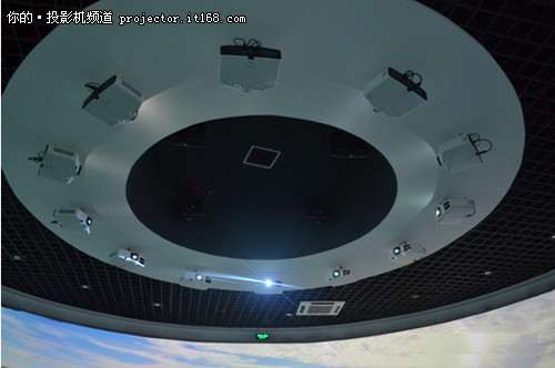 12台CB-G6450WU環形吊裝在天花板上以實現環幕投影。CB-G6450WU可以通過多角度安裝,並能實現360度的旋轉投影,因此安裝位置非常靈活、安裝過程也不複雜。其鏡頭可大範圍移動,垂直移動最大67%,水平移動最高30%,調整投射畫麵十分便捷。