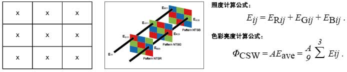 IDMS 文件第15.4 節詳細說明了測量投影機CLO 或色彩亮度的程序。色彩亮度的測量的方法,與白色亮度的測量方法類似;如下圖所示,色彩亮度的測量,需要分別測試NTSR,NTSG,NTSB 測試圖樣中,每個色塊中心點照度值的平均值,與測試圖像的麵積相乘,即得到色彩亮度。