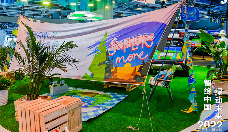 此展區的防潮墊、充氣沙發、可折疊小推車、折疊椅子、戶外防曬冰袖、定製款抱枕被、戶外背包,采用EPSON SureColor F9480H數碼印花打印設備製作。